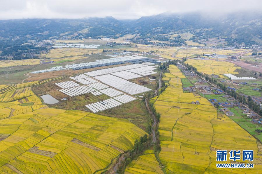 昭覺縣阿并洛古鄉(xiāng)的美麗田園和農(nóng)業(yè)產(chǎn)業(yè)園(10月13日攝,無(wú)人機(jī)照片)。新華社記者 江宏景 攝