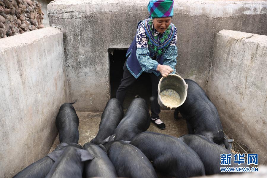 昭覺縣火普村建檔立卡貧困戶曲比子阿木在喂豬(5月11日攝)。新華社記者 江宏景 攝