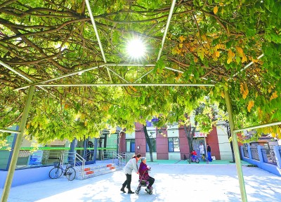 河北唐山市路北區(qū)煤研分院社區(qū)幸福家園養(yǎng)老服務(wù)中心,工作人員陪護(hù)一位老人在院內(nèi)活動。新華社發(fā)