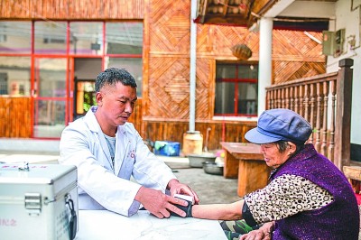 云南貢山獨龍族怒族自治縣獨龍江鄉(xiāng)巴坡村,村醫(yī)在給獨龍族老人測量血壓。 新華社發(fā)