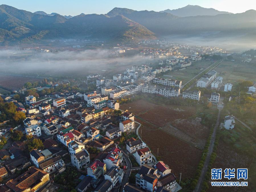 這是11月18日拍攝的沐浴在晨光中的大陳村(無人機照片)。新華社發(fā)(江漢 攝)