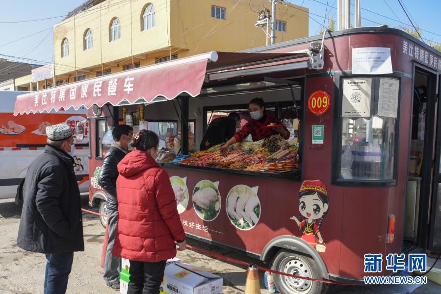 這樣的餐車如今在墨玉縣熱鬧街道都能見到,這是當?shù)匾M扶貧企業(yè)新疆美比特集團有限公司今年新推出的扶貧利民項目。公司配送中心餐車配送負責人邵金介紹,目前有約500個便民餐車活躍在大街小巷,企業(yè)統(tǒng)一配送貨品,確保食品安全,還提供餐車維修服務,未來計劃推廣到整個和田地區(qū)。