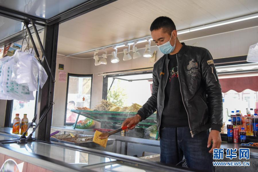 在新疆和田地區(qū)墨玉縣扎瓦鎮(zhèn)客運站旁,阿卜力孜·阿卜杜克熱木在便民餐車中制作食品(10月31日攝)。新華社記者 丁磊
