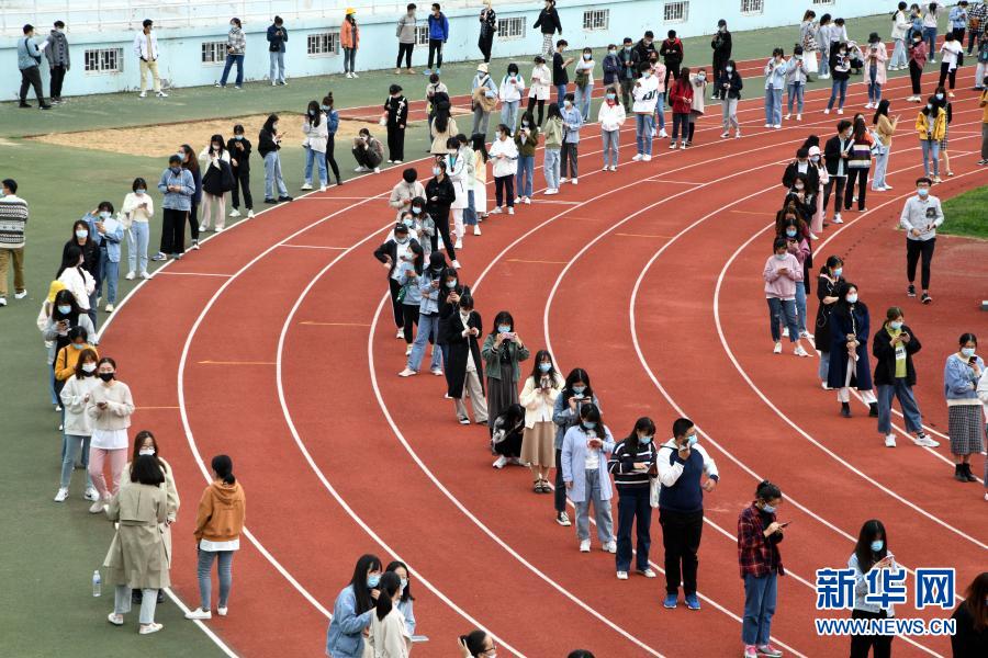 學(xué)生在青島大學(xué)體育場檢測點排隊等待核酸檢測采樣(10月13日攝)。新華社記者 李紫恒 攝