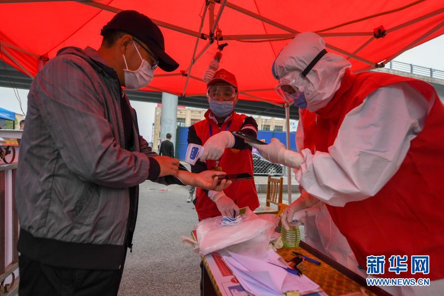 在吉林省舒蘭市弘林家園防疫卡點,青年志愿者為居民測溫登記(5月14日攝)。新華社記者 張楠 攝