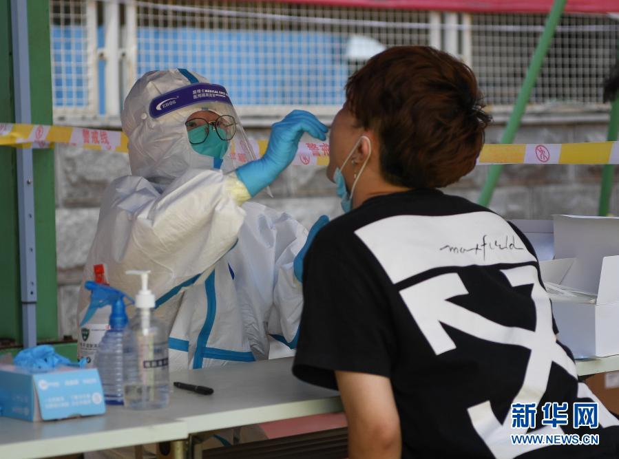 在北京市西城區(qū)北京展覽館南側(cè)的露天廣場核酸檢測采樣點,醫(yī)護人員為前來做檢測的人員進行采樣(6月28日攝)。新華社記者 鞠煥宗 攝