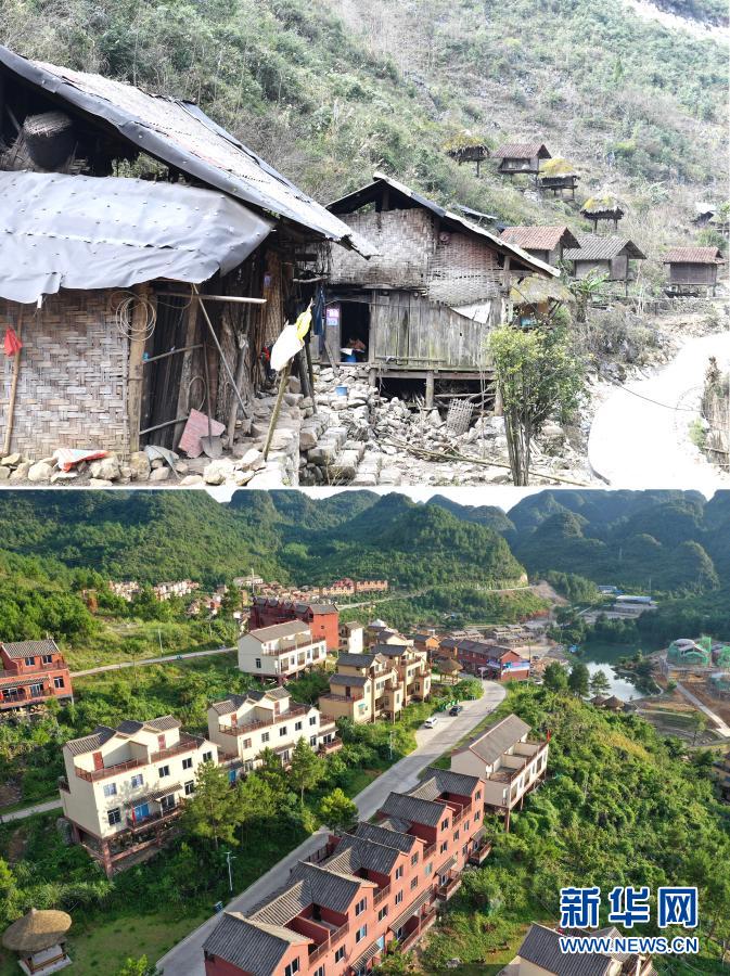 這是一張拼版照片。上圖:整屯搬遷前的廣西南丹縣里湖瑤族鄉(xiāng)董甲村么干屯(2018年1月10日攝)。這里的村民都搬遷到“千家瑤寨·萬(wàn)戶(hù)瑤鄉(xiāng)”里湖王尚易地扶貧搬遷安置點(diǎn)。下圖:“千家瑤寨·萬(wàn)戶(hù)瑤鄉(xiāng)”里湖王尚易地扶貧搬遷安置點(diǎn)(8月4日攝,無(wú)人機(jī)照片)。新華社記者 周華 攝