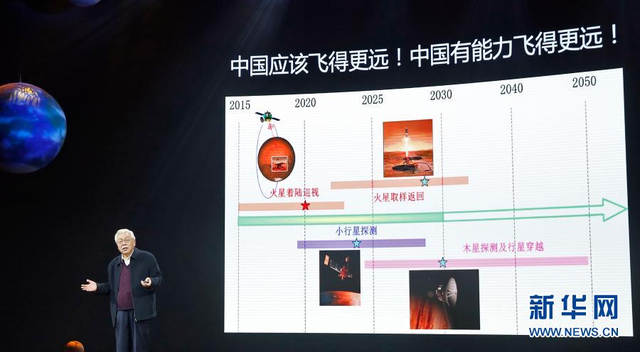 “這次嫦娥五號(hào)肩負(fù)著月球采樣返回的光榮使命,我們的天問(wèn)一號(hào)也正在飛向火星的路上,我們還要飛得更遠(yuǎn),去探測(cè)木星、小行星并建設(shè)我們的國(guó)際月球科研站。中國(guó)已經(jīng)昂首進(jìn)入了深空探測(cè)的新時(shí)代。”歐陽(yáng)自遠(yuǎn)說(shuō)。