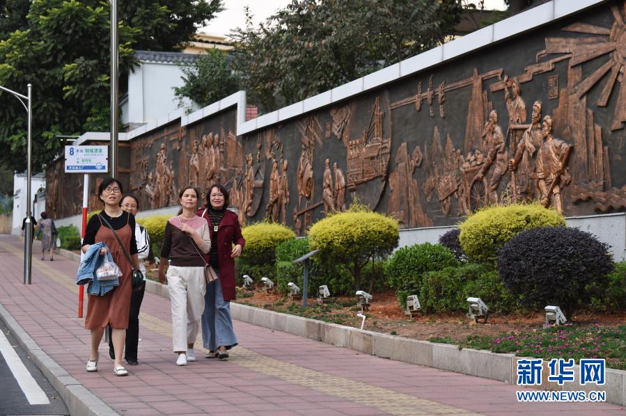 11月17日,行人在福建省三明市三鋼集團生活區(qū)走過浮雕墻。新華社記者 姜克紅 攝