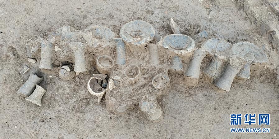 圖為河南葉縣余莊遺址標(biāo)號為T0405的探方出土的陶器,該組陶器擺放有序,呈現(xiàn)出鮮明的禮制色彩(11月3日攝)。新華社發(fā)(河南省文物考古研究院供圖)