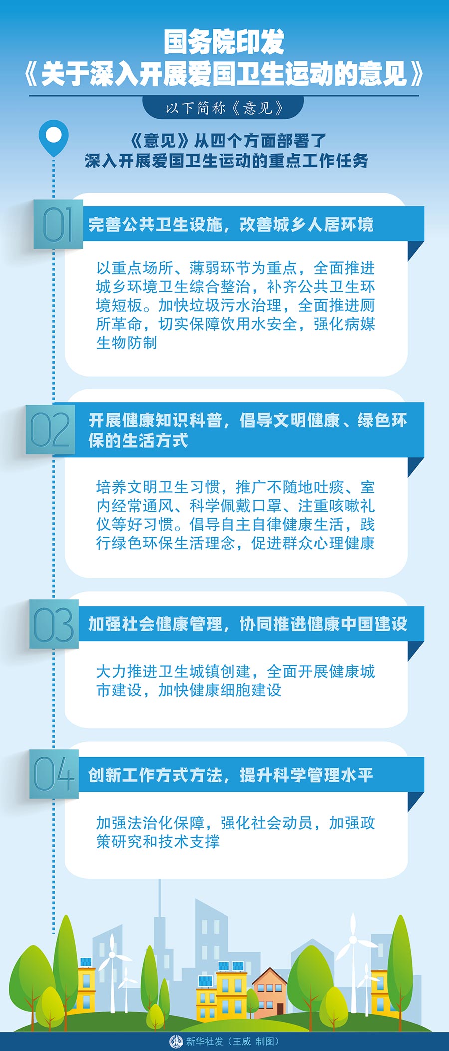 《意見》從四個方面部署了深入開展愛國衛(wèi)生運(yùn)動的重點(diǎn)工作任務(wù)。一是完善公共衛(wèi)生設(shè)施,改善城鄉(xiāng)人居環(huán)境。以重點(diǎn)場所、薄弱環(huán)節(jié)為重點(diǎn),全面推進(jìn)城鄉(xiāng)環(huán)境衛(wèi)生綜合整治,補(bǔ)齊公共衛(wèi)生環(huán)境短板。加快垃圾污水治理,全面推進(jìn)廁所革命,切實(shí)保障飲用水安全,強(qiáng)化病媒生物防制。二是開展健康知識科普,倡導(dǎo)文明健康、綠色環(huán)保的生活方式。培養(yǎng)文明衛(wèi)生習(xí)慣,推廣不隨地吐痰、室內(nèi)經(jīng)常通風(fēng)、科學(xué)佩戴口罩、注重咳嗽禮儀等好習(xí)慣。倡導(dǎo)自主自律健康生活,踐行綠色環(huán)保生活理念,促進(jìn)群眾心理健康。三是加強(qiáng)社會健康管理,協(xié)同推進(jìn)健康中國建設(shè)。大力推進(jìn)衛(wèi)生城鎮(zhèn)創(chuàng)建,全面開展健康城市建設(shè),加快健康細(xì)胞建設(shè)。四是創(chuàng)新工作方式方法,提升科學(xué)管理水平。加強(qiáng)法治化保障,強(qiáng)化社會動員,加強(qiáng)政策研究和技術(shù)支撐。