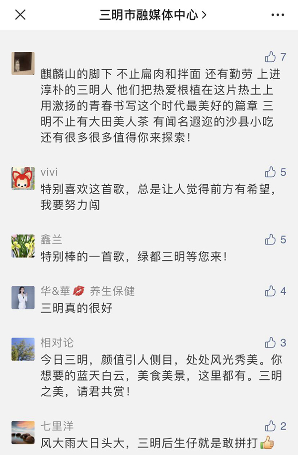 “我大福建真是處處美得沒(méi)話說(shuō)!”“哈哈,我大沙縣又壓軸了?!薄疤寐?tīng)了!內(nèi)心充滿自豪!”“開(kāi)門見(jiàn)綠,抬頭見(jiàn)藍(lán),這就是我的家鄉(xiāng)。”還有網(wǎng)友希望這首歌“能上春晚”。更有網(wǎng)友吟誦起三明,“好山好水好風(fēng)情,數(shù)一數(shù)二數(shù)三明。紅軍長(zhǎng)征出發(fā)地,客家文化傳世界 …… ”