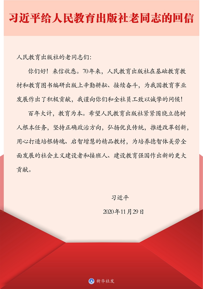 你們好!來信收悉。70年來,人民教育出版社在基礎(chǔ)教育教材和教育圖書編研出版上辛勤耕耘、接續(xù)奮斗,為我國教育事業(yè)發(fā)展作出了積極貢獻,我謹向你們和全社員工致以誠摯的問候!