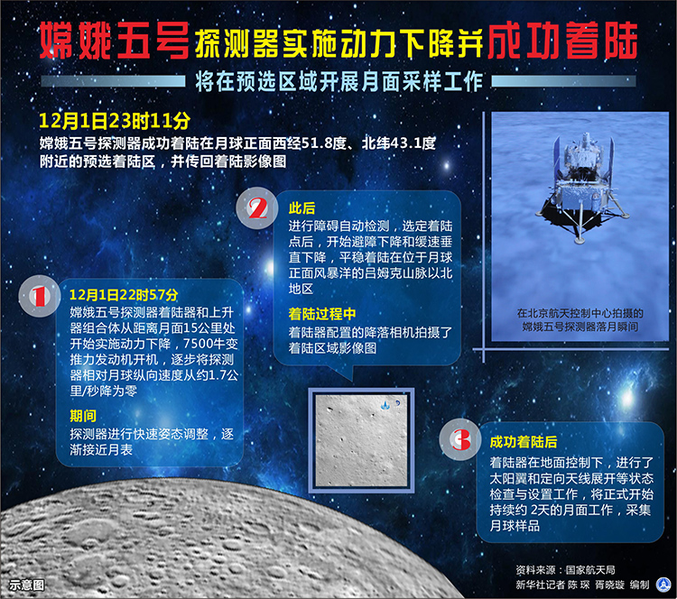 圖表:嫦娥五號探測器實施動力下降并成功著陸 將在預選區(qū)域開展月面采樣工作 新華社記者 陳琛 編制