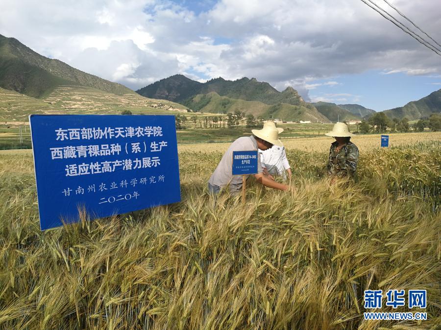 天津農(nóng)學院種子科學與工程系主任趙飛(左)在甘肅省甘南州建成的青稞增產(chǎn)技術(shù)集成示范基地工作(8月5日攝)。新華社發(fā)