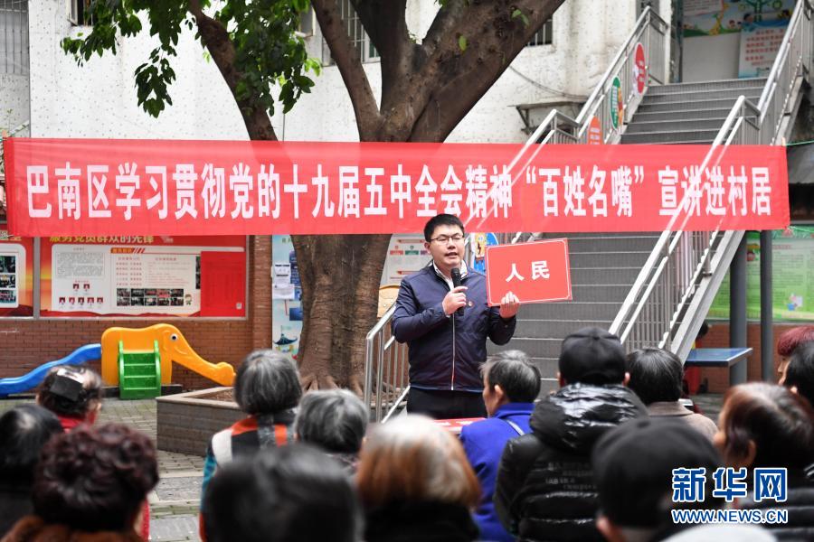 12月1日,宣講員向群眾宣講黨的十九屆五中全會精神。12月1日,重慶市巴南區(qū)魚洞街道魚新街社區(qū)舉行學(xué)習(xí)貫徹黨的十九屆五中全會精神“百姓名嘴”進(jìn)村居活動(dòng)。據(jù)介紹,重慶市巴南區(qū)“百姓名嘴”宣講團(tuán)是由基層干部、教師、民間藝人等基層理論骨干自愿組成的理論宣講隊(duì)伍,現(xiàn)有宣講員85名。宣講團(tuán)成員將理論宣講與評書、快板、三句半、木洞山歌等文藝形式相結(jié)合,目前已在巴南區(qū)開展了110余場學(xué)習(xí)貫徹黨的十九屆五中全會精神宣講活動(dòng)。新華社記者 唐奕 攝