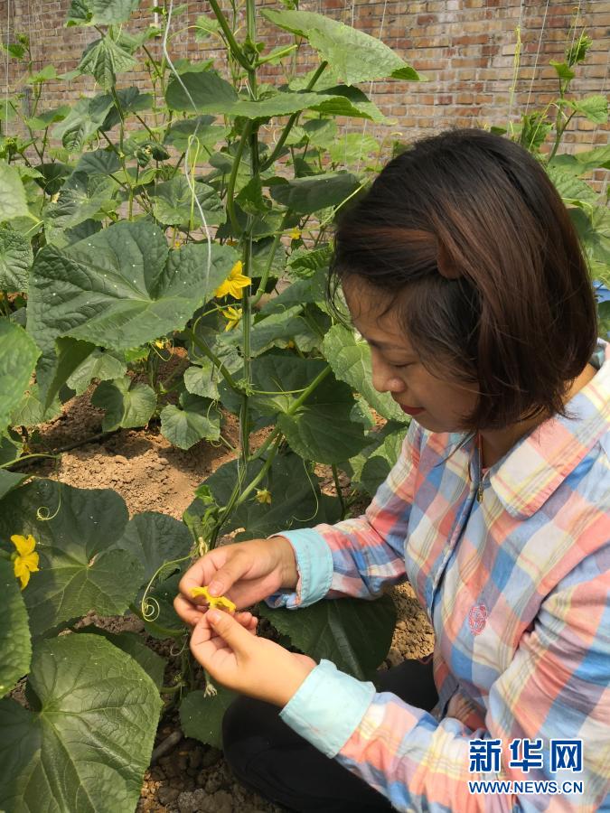 李愚鶴在田間進(jìn)行人工授粉(2019年6月27日攝)。新華社發(fā)(天津科潤(rùn)黃瓜研究所供圖)