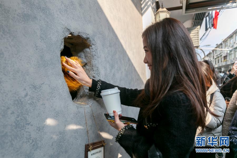 12月4日,一名顧客與伸出洞口的“熊爪”互動。新華社記者 王翔 攝