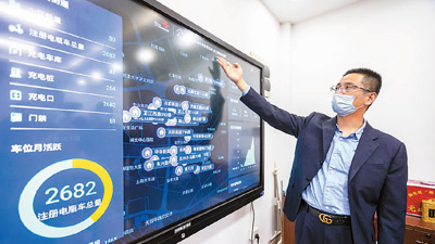 今年以來,上海市靜安區(qū)芷江西路街道對轄區(qū)內(nèi)的老舊小區(qū)非機動車車庫(棚)進行智能化改造,利用物聯(lián)網(wǎng)技術(shù)將車輛相關(guān)信息傳遞到小區(qū)物業(yè)公司管理平臺。圖為工作人員介紹非機動車庫管理系統(tǒng)。王 翔攝(新華社發(fā))