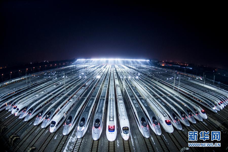 動車組停靠在武漢動車段的存車線上,準(zhǔn)備進(jìn)行檢修和保溫作業(yè)(2018年2月1日攝)。新華社記者 肖藝九 攝