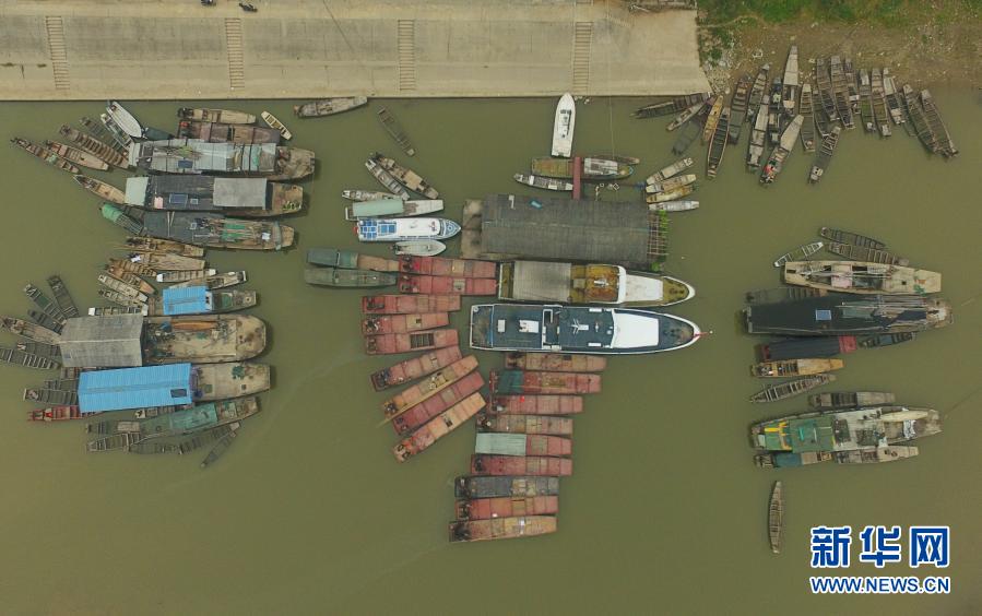 在湖南常德漢壽縣蔣家嘴鎮(zhèn),待回收的鐵漁船停靠在洞庭湖邊(2019年12月17日攝,無人機(jī)照片)。2020年1月1日零時起,長江流域332個自然保護(hù)區(qū)和水產(chǎn)種質(zhì)資源保護(hù)區(qū)全面禁止生產(chǎn)性捕撈。新華社記者 薛宇舸 攝