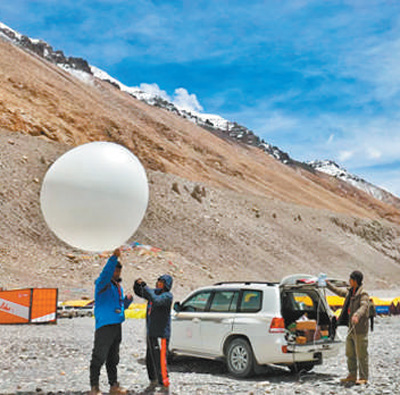 西藏自治區(qū)氣象局2020珠峰高程測(cè)量氣象探測(cè)保障服務(wù)隊(duì)施放高空氣象探測(cè)氣球。自然資源部供圖