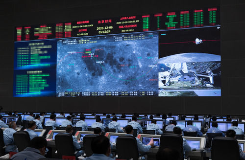 12月6日,航天科技人員在北京航天飛行控制中心指揮大廳監(jiān)測嫦娥五號(hào)上升器與軌道器返回器組合體交會(huì)對(duì)接情況。新華社記者 金立旺 攝