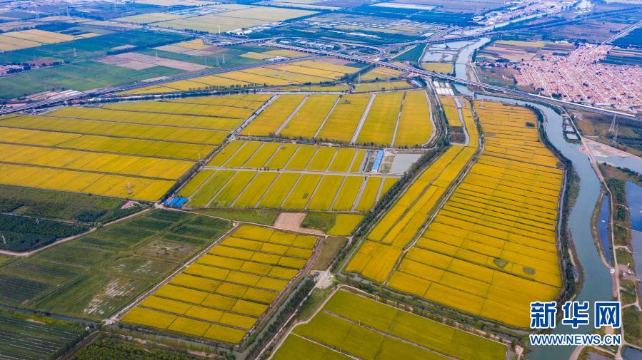 9月22日拍攝的河北省唐山市蘆臺(tái)經(jīng)濟(jì)開發(fā)區(qū)海北鎮(zhèn)的水稻田(無人機(jī)照片)。