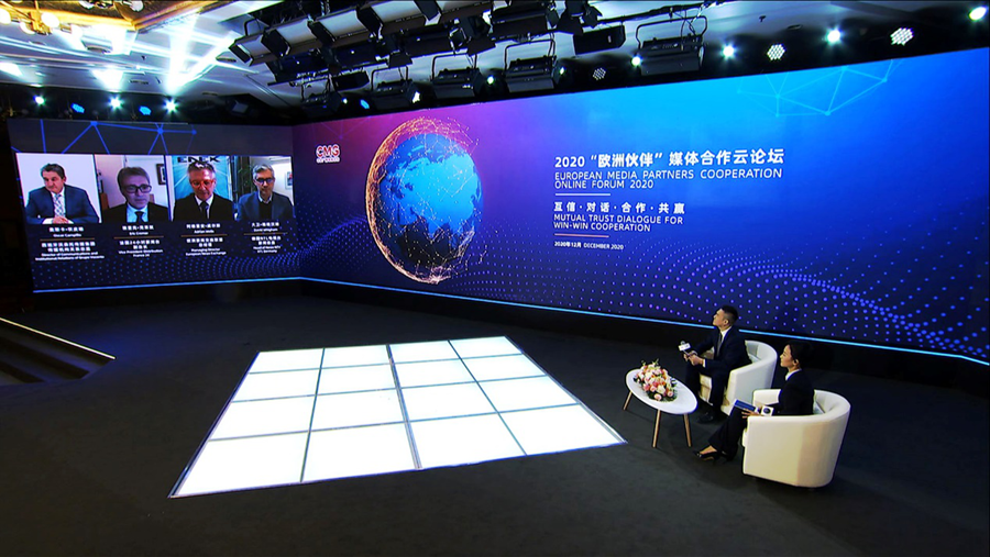 12月10日,中央廣播電視總臺(tái)以視頻連線的方式舉辦2020“歐洲伙伴”媒體合作云論壇。中宣部副部長、中央廣播電視總臺(tái)臺(tái)長、總編輯慎海雄出席并發(fā)表致辭,強(qiáng)調(diào)堅(jiān)持多邊主義,加強(qiáng)對話交流,構(gòu)建中歐媒體伙伴關(guān)系。中央廣播電視總臺(tái)相關(guān)代表與來自歐洲地區(qū)16個(gè)國家25家媒體機(jī)構(gòu)的28名與會(huì)代表圍繞“互信·對話·合作·共贏”主題,相聚云端展開對話,共同發(fā)布《加強(qiáng)媒體合作聯(lián)合聲明》,積極推動(dòng)中歐媒體加強(qiáng)合作、同舟共濟(jì)、團(tuán)結(jié)抗疫,提振國際社會(huì)信心。