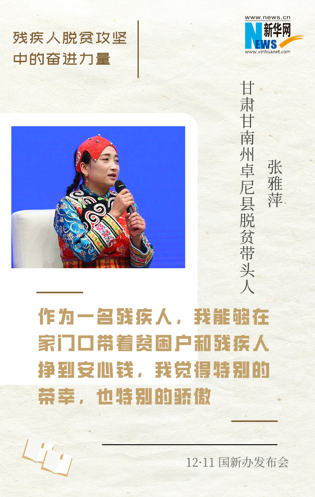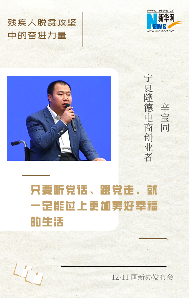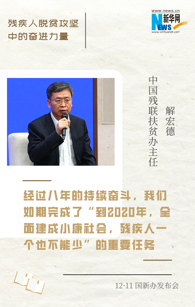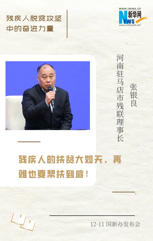 新華網(wǎng)北京12月11日電(王瑩)在脫貧攻堅(jiān)的戰(zhàn)場上,涌現(xiàn)出許多殘疾人自強(qiáng)脫貧的先進(jìn)典型和脫貧攻堅(jiān)一線奮力拼搏的工作者。12月11日上午,國新辦邀請到他們中的4位代表,圍繞“殘疾人脫貧攻堅(jiān)中的奮進(jìn)力量”與中外記者見面交流。一起來聽他們的脫貧故事和脫貧經(jīng)驗(yàn)。