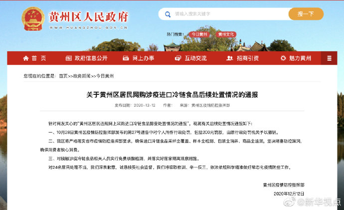 湖北省黃岡市黃州區(qū)人民政府網(wǎng)站12日發(fā)布通報,撤銷對網(wǎng)購涉疫進口冷鏈?zhǔn)称穫€人所作的行政處罰,包括200元罰款。 ????