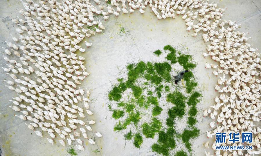 工人在貴州省黔東南苗族侗族自治州錦屏縣馬臺商品鵝養(yǎng)殖基地投放草料(3月11日攝,無人機照片)。新華社記者 楊文斌 攝