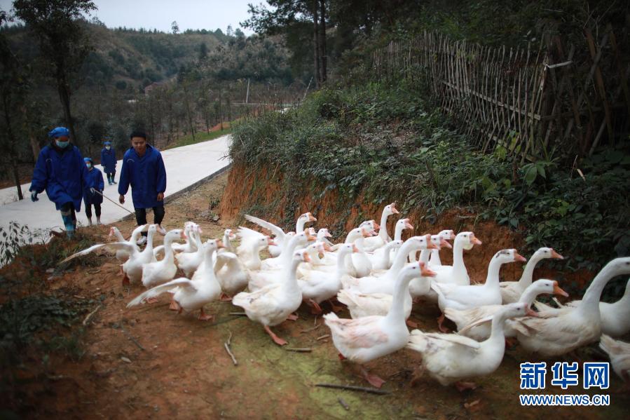 工作人員在貴州省黔東南苗族侗族自治州錦屏縣馬臺商品鵝養(yǎng)殖基地養(yǎng)鵝(12月8日攝)。新華社記者 劉續(xù) 攝