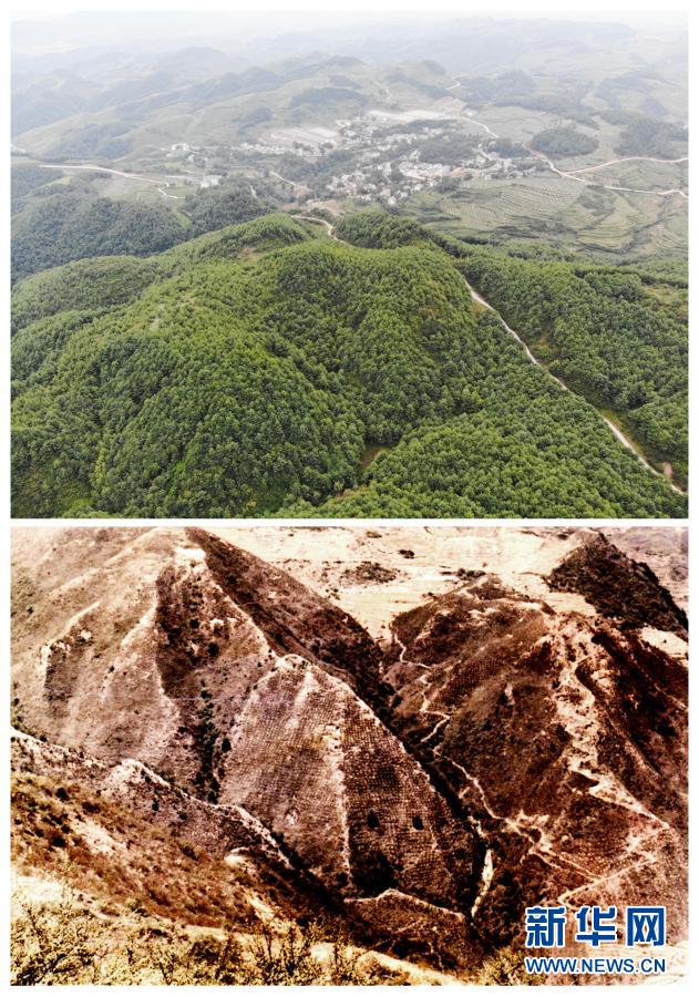 拼版照片:上圖為2019年7月25日拍攝的貴州省赫章縣河鎮(zhèn)鄉(xiāng)海雀村披綠的山坡(無人機照片,新華社記者楊文斌攝);下圖為上世紀80年代海雀村石漠化嚴重的山坡(資料照片)。新華社發(fā)