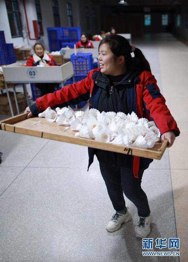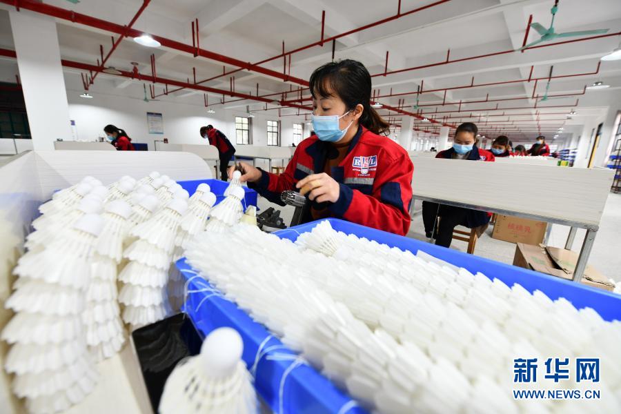 工人在位于貴州省錦屏縣敦寨鎮(zhèn)的貴州亞獅龍體育文化產(chǎn)業(yè)發(fā)展有限公司羽毛球加工廠工作(3月12日攝)。新華社記者 楊文斌 攝