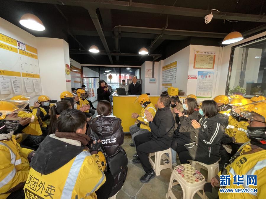 在寧夏回族自治區(qū)吳忠市同心縣,“啟夢筑夢”青年講師團講師楊克斌為30多名外賣配送員開展“微宣講”(12月8日攝)。新華社記者 馬麗娟 攝
