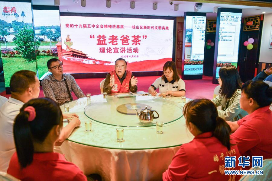 11月13日,海南省海口市瓊山區(qū)紅城湖邊的一家老爸茶館內(nèi),退休老干部郭仁忠在宣講黨的十九屆五中全會精神。新華社發(fā)(龍泉 攝)