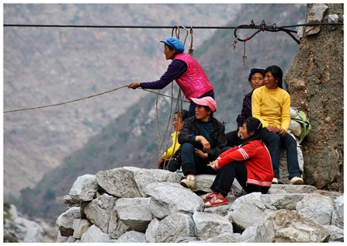 ????2013年3月7日,云南省會澤縣火紅鄉(xiāng)的村民牽引溜索過江。楊文斌 攝