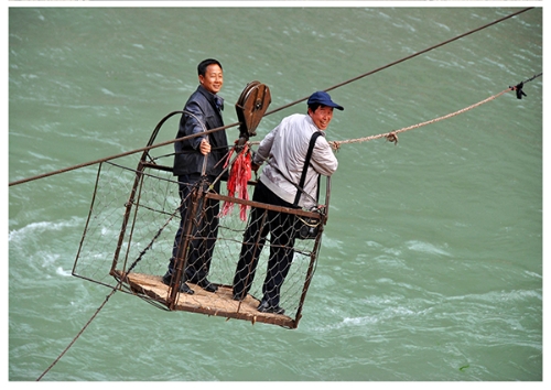 ????2013年3月7日,云南省會澤縣火紅鄉(xiāng)的村民乘坐溜索到貴州省威寧縣。楊文斌 攝