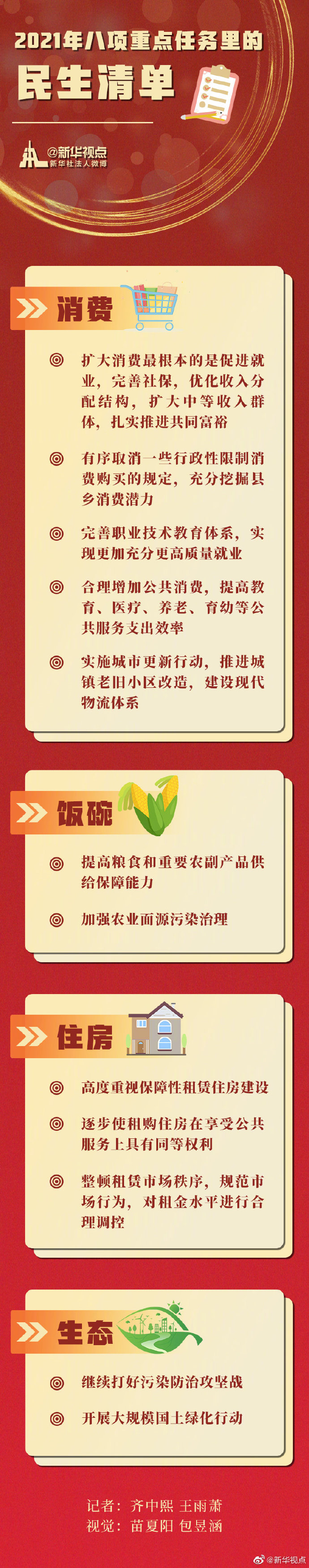 保障和改善民生始終是經(jīng)濟(jì)工作的重點。中央經(jīng)濟(jì)工作會議規(guī)劃的2021年八項重點任務(wù)中,涉及民生的內(nèi)容占有相當(dāng)篇幅。記者從中梳理出這樣一份“民生清單”,件件都與你我相關(guān)—— ?????