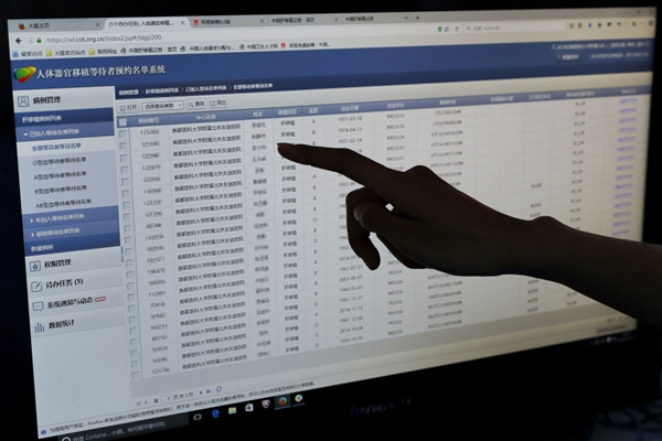 ▲ 在首都醫(yī)科大學(xué)附屬北京友誼醫(yī)院,一臺電腦顯示“中國人體器官分配與共享計算機系統(tǒng)”(COTRS)中的人體器官移植等待者預(yù)約名單。新華社記者 沈伯韓攝