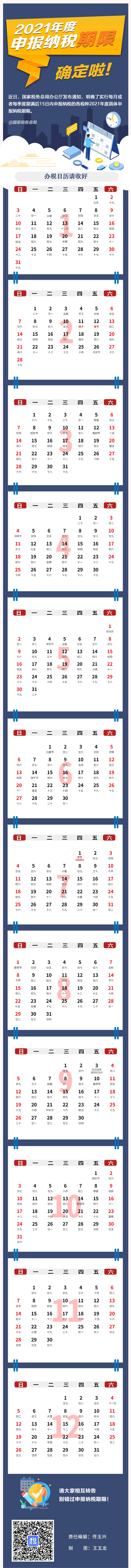近日,國家稅務總局辦公廳發(fā)布《關于明確2021年度申報納稅期限的通知》(稅總辦函〔2020〕242號),明確實行每月或者每季度期滿后15日內(nèi)申報納稅的各稅種2021年度具體申報納稅期限。為了方便納稅人每月查找辦稅日期,一張動圖送給你!快收藏起來吧~