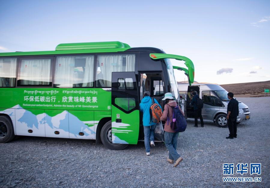 游客在珠穆朗瑪峰景區(qū)停車場轉(zhuǎn)乘環(huán)??蛙嚕?019年5月16日攝)。珠穆朗瑪峰景區(qū)內(nèi)自2019年5月開始試運(yùn)營清潔能源環(huán)??蛙嚕赃M(jìn)一步平衡珠峰地區(qū)旅游發(fā)展與環(huán)境保護(hù)需要。新華社記者 孫非 攝