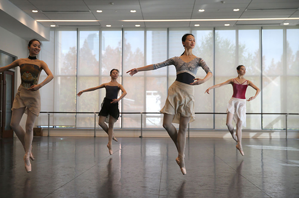 12月15日,項(xiàng)陽(yáng)(右二)和同伴在上海芭蕾舞團(tuán)排練廳里排練。