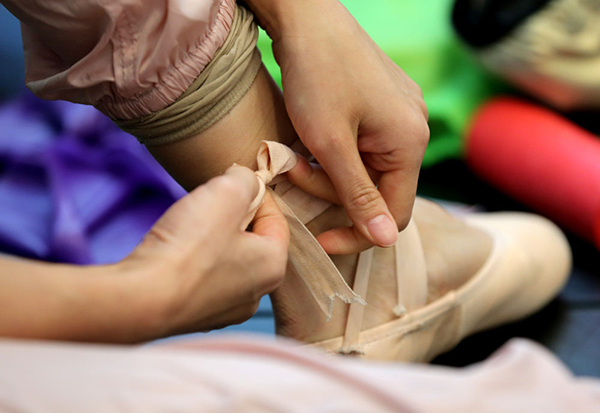 12月15日,項(xiàng)陽(yáng)在基礎(chǔ)訓(xùn)練課前綁足尖鞋。