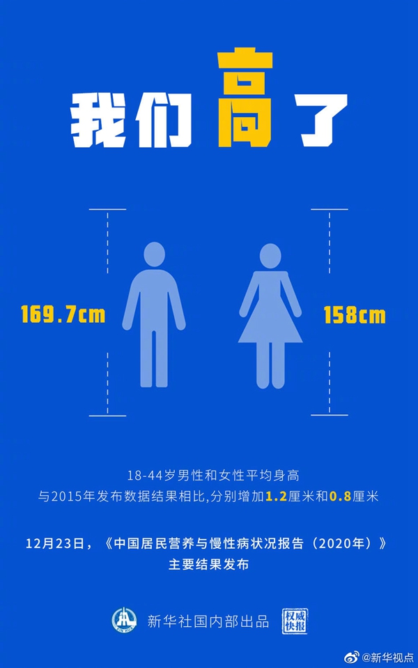 你的營養(yǎng)和健康情況怎樣?高了?身體倍棒?12月23日,一份關(guān)乎你我的健康大數(shù)據(jù)重磅上新,《中國居民營養(yǎng)與慢性病狀況報告(2020年)》主要結(jié)果發(fā)布——成人平均身高繼續(xù)增長,營養(yǎng)不足問題得到改善,健康意識逐步增強。(記者:陳聰,海報設(shè)計:張晨光) ????