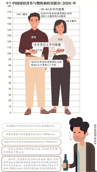 根據(jù)發(fā)布數(shù)據(jù),目前我國18歲及以上居民男性和女性的平均體重分別為69.6千克和59千克,與2015年發(fā)布結(jié)果相比分別增加3.4千克和1.7千克,超重肥胖問題凸顯。