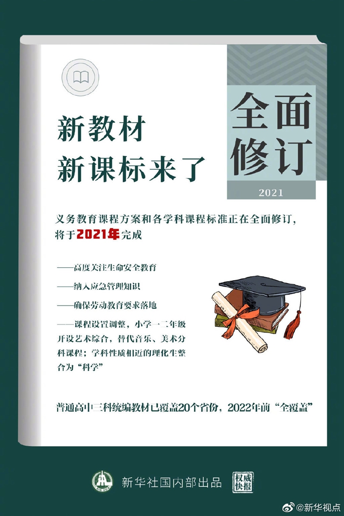 中小學(xué)校開什么課?學(xué)什么?怎么學(xué)?12月24日,教育部召開新聞發(fā)布會(huì)介紹,義務(wù)教育課程方案和各學(xué)科課程標(biāo)準(zhǔn)正在全面修訂,將于2021年完成。此外,普通高中道德與法治(思想政治)、語文、歷史三科統(tǒng)編教材已覆蓋20個(gè)省份,2022年前將實(shí)現(xiàn)所有省份“全覆蓋”,到2025年實(shí)現(xiàn)所有年級(jí)“全覆蓋”。(記者胡浩 海報(bào)設(shè)計(jì)張晨光)