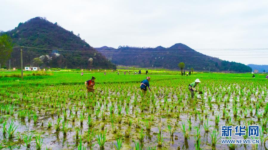 貴州省黔南布依族苗族自治州長(zhǎng)順縣核子村村民在茭白地里松土(3月5日)。新華社發(fā)(蒯華揚(yáng) 攝)