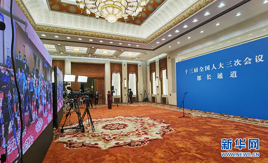 5月22日,十三屆全國人大三次會議開幕會結(jié)束后,首場“部長通道”采訪活動在人民大會堂新聞發(fā)布廳舉行,邀請部分列席會議的國務(wù)院有關(guān)部委負(fù)責(zé)人通過網(wǎng)絡(luò)視頻方式接受采訪。圖為“部長通道”現(xiàn)場。新華網(wǎng) 王翰林 攝